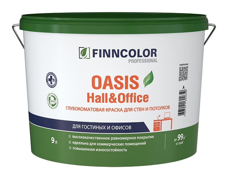 Водно-дисперсионная краска для внутренних работ FINNCOLOR OASIS HALL & OFFICE. Подходит для жилых и коммерческих помещений с нормальной влажностью. Выдерживает умеренные нагрузки при эксплуатации, устойчива к мытью. Образует декоративное глубокоматовое покрытие.