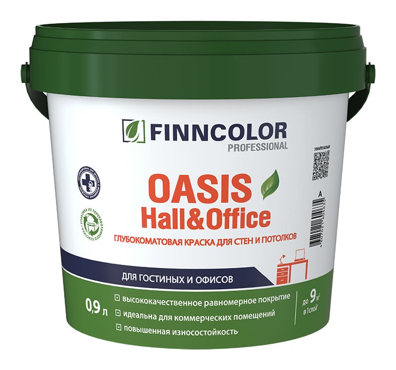 Водно-дисперсионная краска для внутренних работ FINNCOLOR OASIS HALL & OFFICE. Подходит для жилых и коммерческих помещений с нормальной влажностью. Выдерживает умеренные нагрузки при эксплуатации, устойчива к мытью. Образует декоративное глубокоматовое покрытие.