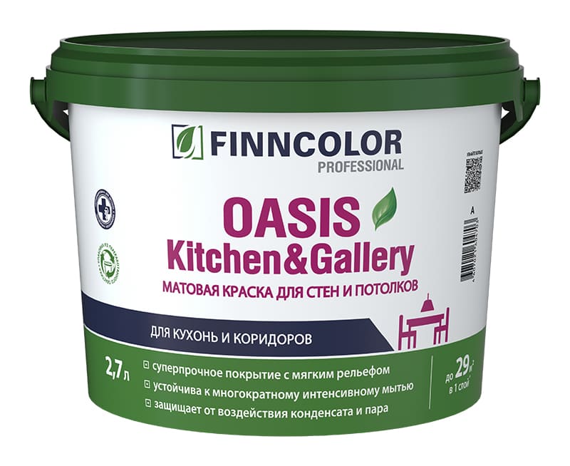 Матовая с шелковистым эффектом, особо устойчивая к мытью (1 класс по стандарту EN 13300/ISO 11998) водно-дисперсионная краска FINNCOLOR OASIS KITCHEN & GALLERY для высококачественной отделки поверхностей внутри помещений c высокой эксплуатационной нагрузкой.
