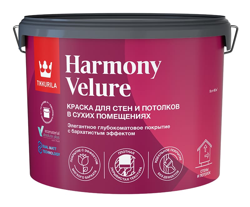 - Интерьерная глубокоматовая экологичная краска Tikkurila Harmony Velure создает мягкую бархатистую поверхность, к которой так и хочется прикоснуться Ее можно использовать при создании как минималистичных, так и богато декорированных интерьеров, ведь бархат - излюбленный материал королей и богемы Tikkurila Harmony относится к высшему классу эмиссии строительных материалов М1 Такие материалы практически не выделяют вредных веществ Подходит для окраски новых и ранее окрашенных оштукатуренных, бетонных, зашпатлеванных, кирпичных, картонных, деревянных и гипсокартонных поверхностей, а также древесностружечных и древесноволокнистых плит внутри помещений Не подходит для окраски дверей и мебели