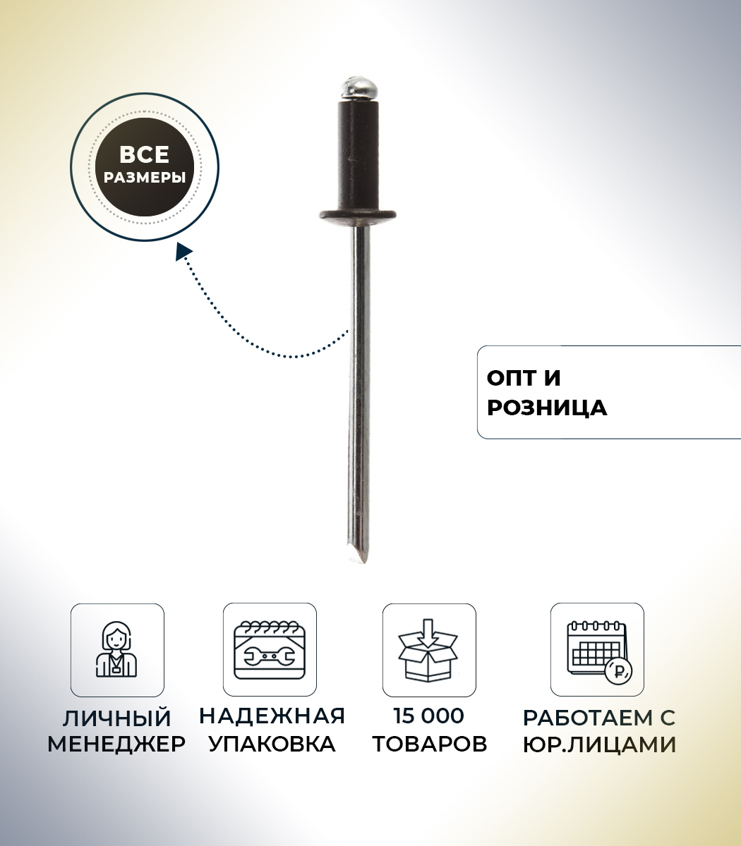 Большим плюсом при работе с данным видом крепежа считается то, что доступ может быть только с одной лицевой стороны. Заклепки окрашиваются в цвета стандартной палитры RAL, например в глубокий черный. При необходимости мы окрашиваем заклепки в нужные вам цвета.